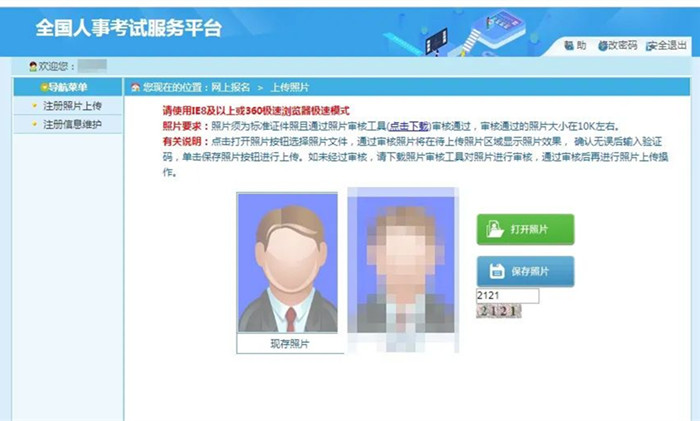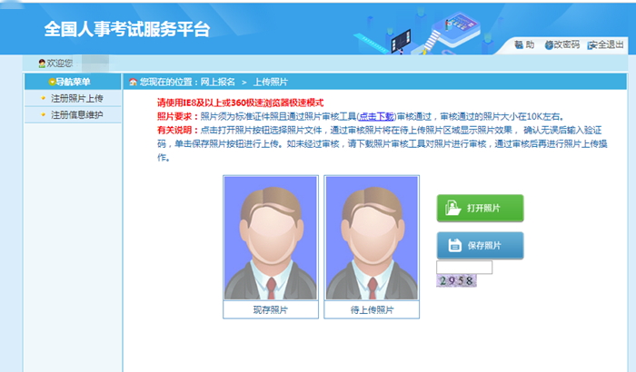 進(jìn)入登錄界面,首次登錄系統(tǒng)需要上傳照片,系統(tǒng)只能上傳通過中國(guó)人事考試網(wǎng)發(fā)布的照片處理工具(http://download.people.com.cn/zhaopianshenhe.rar)處理后的照片,點(diǎn)擊“打開照片”按鈕選擇要上傳的照片,輸入驗(yàn)證碼,點(diǎn)擊“保存照片”,上傳成功后跳轉(zhuǎn)到照片確認(rèn)頁面,核對(duì)照片無誤后點(diǎn)擊“確定”。