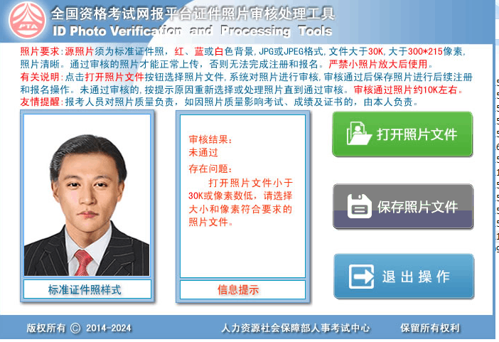 1.照片處理工具是對(duì)報(bào)考者所需上傳照片進(jìn)行標(biāo)準(zhǔn)化處理的專用照片處理軟件。照片上傳之前均須通過“照片處理工具”進(jìn)行處理、保存,否則無法完成照片上傳和后續(xù)相關(guān)操作。源照片要求:報(bào)考者本人近期免冠正面電子證件照片(藍(lán)底或白底證件照,JPG或JPEG格式,照片寬度不低于295像素,高度不低于413像素)。