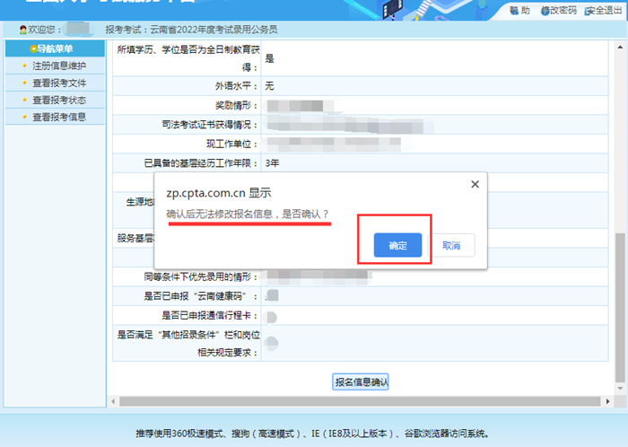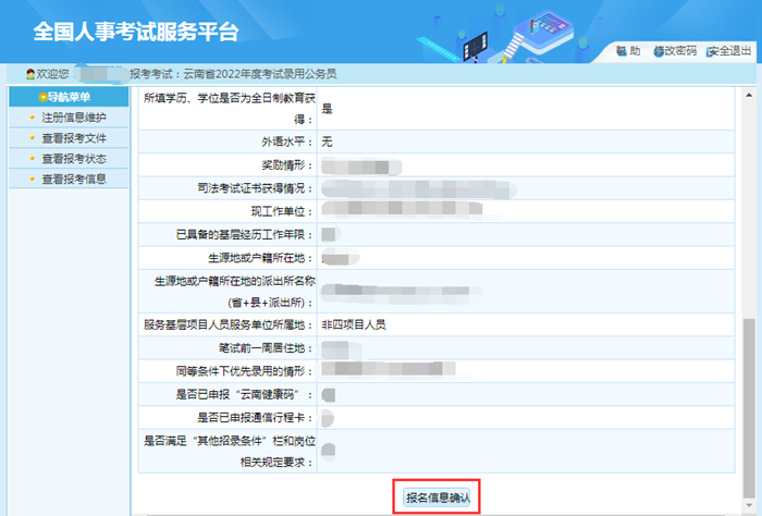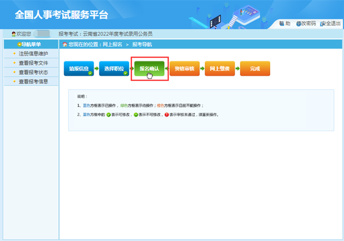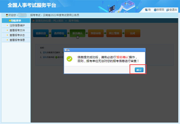 1.只有在“報(bào)名信息確認(rèn)”頁面點(diǎn)擊“確認(rèn)”按鈕后,才將個(gè)人報(bào)考信息提交至招考部門,如未完成“報(bào)名信息確認(rèn)”操作,報(bào)名過程未全部完成,招考部門將無法看到報(bào)考者信息,無法進(jìn)行資格審查。