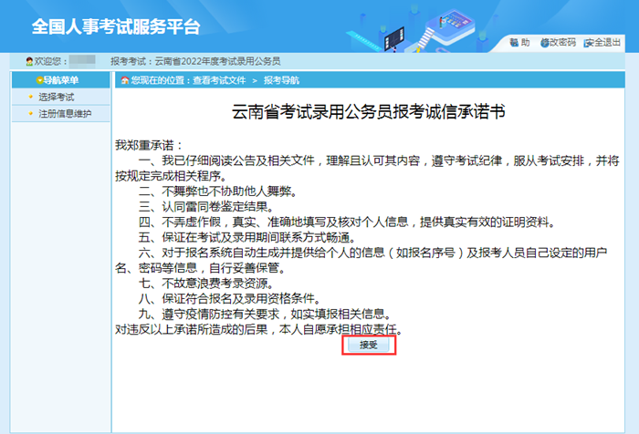 報(bào)考者登錄后,閱讀“報(bào)考須知”頁面,閱讀完“報(bào)考須知”后點(diǎn)擊“接受”后進(jìn)入“報(bào)考者承諾書”,閱讀并接受“報(bào)考者承諾書”后進(jìn)入“填寫個(gè)人信息”。