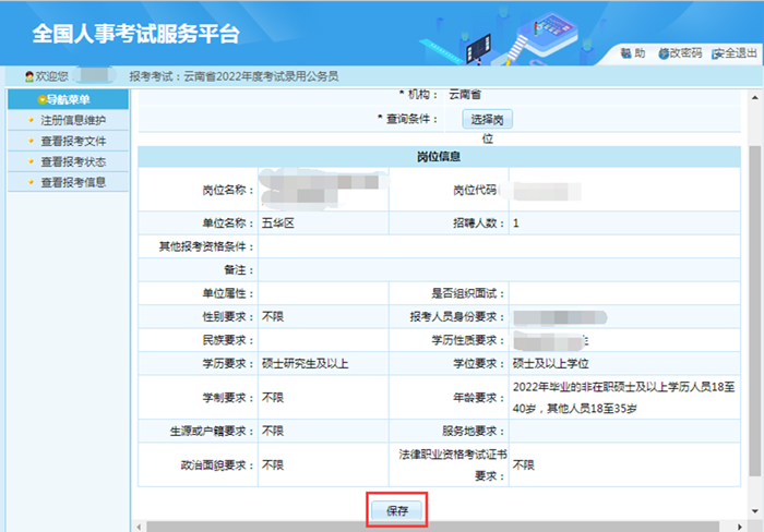 個(gè)人信息填寫完成,點(diǎn)擊“保存”后保存?zhèn)€人信息,如個(gè)人信息填寫錯(cuò)誤,點(diǎn)擊“查看報(bào)考狀態(tài)”“信息維護(hù)”按鈕進(jìn)行修改。