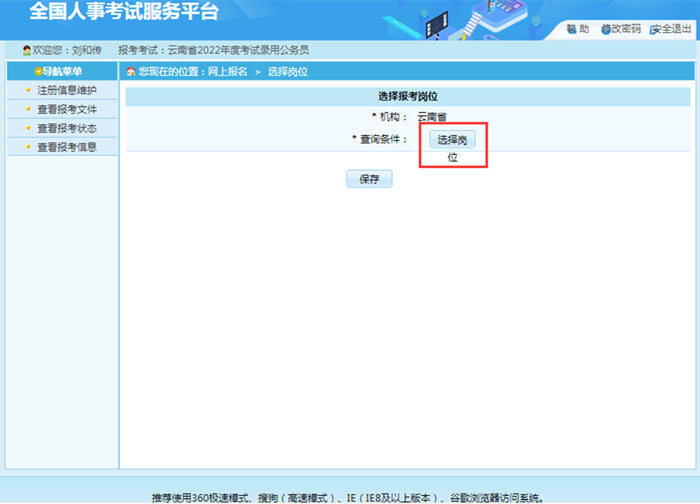 報(bào)考者填寫個(gè)人信息完成點(diǎn)擊“保存”,提示保存成功后,跳轉(zhuǎn)到報(bào)考流程頁面。點(diǎn)擊“選擇職位”選項(xiàng),跳轉(zhuǎn)到選擇報(bào)考職位界面,報(bào)考者可以點(diǎn)擊“選擇職位”按鈕,通過樹形菜單選擇對(duì)應(yīng)的職位,選擇對(duì)應(yīng)的職位后,系統(tǒng)會(huì)提示報(bào)考該職位所需的條件,選擇相應(yīng)的職位,點(diǎn)擊“保存”按鈕,提示保存成功后,跳轉(zhuǎn)到報(bào)考流程頁面。