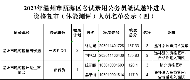 2023年浙江公務(wù)員考試溫州甌海區(qū)遞補(bǔ)資格復(fù)審(體能測(cè)評(píng))人員名單公示(四)