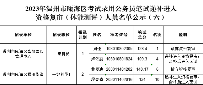 2023年溫州市甌海區(qū)考試錄用公務(wù)員筆試遞補進(jìn)入資格復(fù)審(體能測評)人員名單公示(六)
