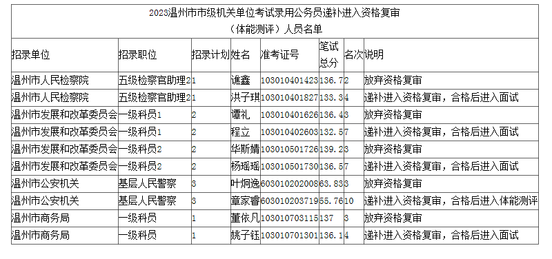 2023年浙江公務(wù)員考試溫州市級(jí)機(jī)關(guān)遞補(bǔ)資格復(fù)審(體能測(cè)評(píng))人員名單