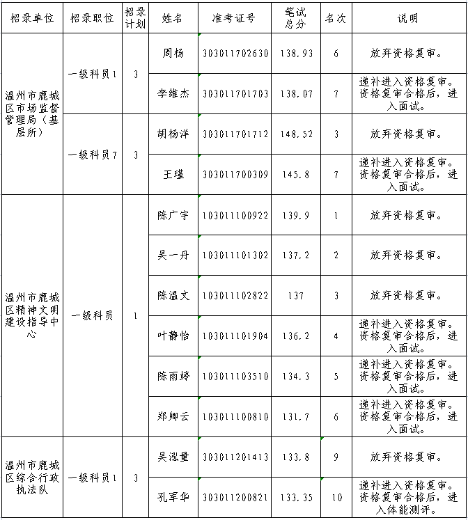 2023年浙江公務(wù)員考試溫州鹿城區(qū)資格復(fù)審和體能測(cè)評(píng)遞補(bǔ)人員名單