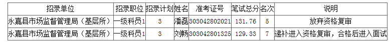 2023年浙江公務(wù)員考試溫州永嘉縣遞補(bǔ)資格復(fù)審人員名單(一)