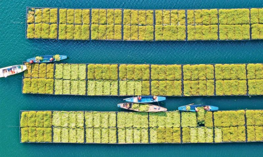 浙江省杭州市淳安縣在千島湖典型庫灣、入湖口等區(qū)域,運(yùn)用生態(tài)浮島水上無土栽培技術(shù)種植水生蔬菜,努力探索“兩山”價值轉(zhuǎn)化新路徑。圖為2023年2月21日,工作人員正在采摘水生蔬菜。人民圖片楊波/攝