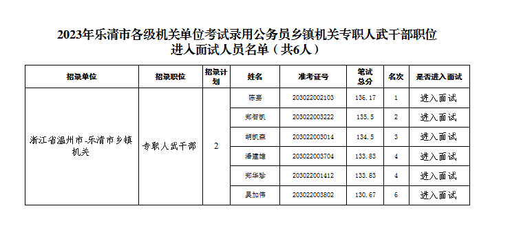 2023年浙江公務(wù)員考試溫州樂清市鄉(xiāng)鎮(zhèn)機(jī)關(guān)專職人武干部職位面試人員名單