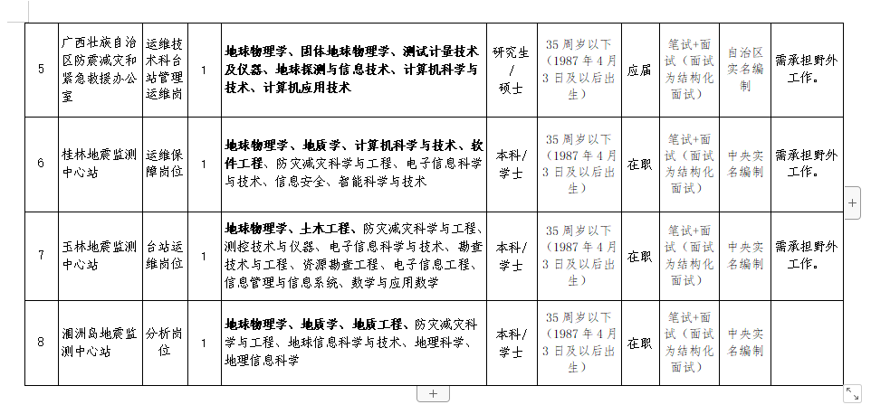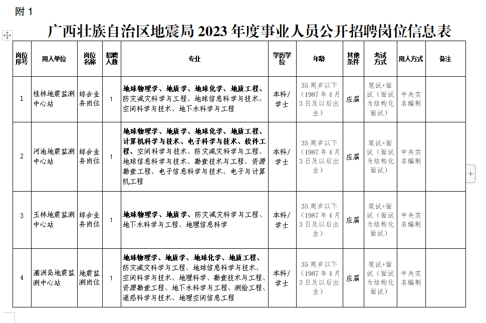附1 廣西壯族自治區(qū)地震局2023年度事業(yè)人員公開招聘崗位信息表.docx