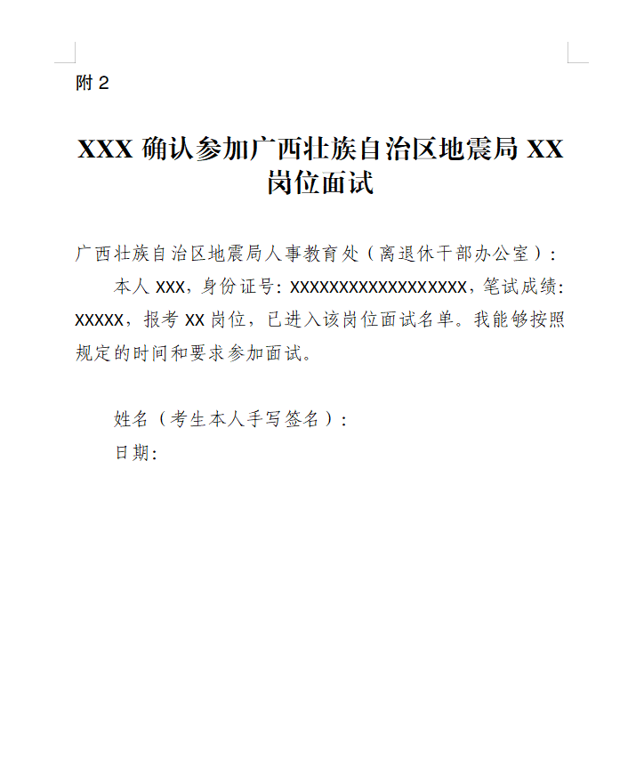 (2)電子郵件標(biāo)題統(tǒng)一寫成“XXX確認(rèn)參加廣西壯族自治區(qū)地震局XX崗位面試”,手寫簽名圖片或掃描件發(fā)送,內(nèi)容見附2。如網(wǎng)上報名時填報的通訊地址、聯(lián)系方式等信息發(fā)生變化,請在電子郵件和傳真中注明。
