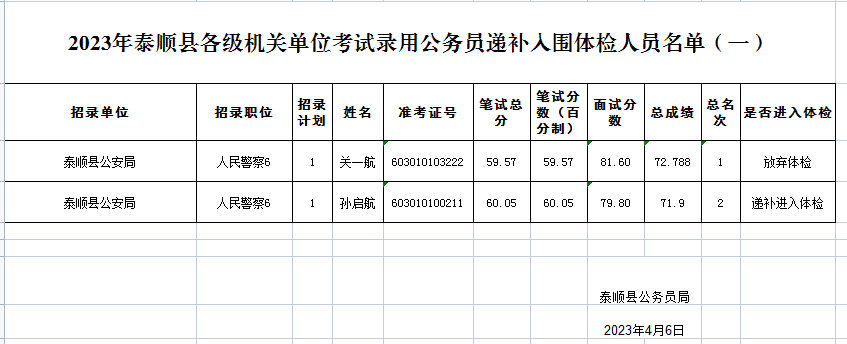 2023年浙江公務(wù)員考試溫州泰順縣遞補入圍體檢人員名單(一)