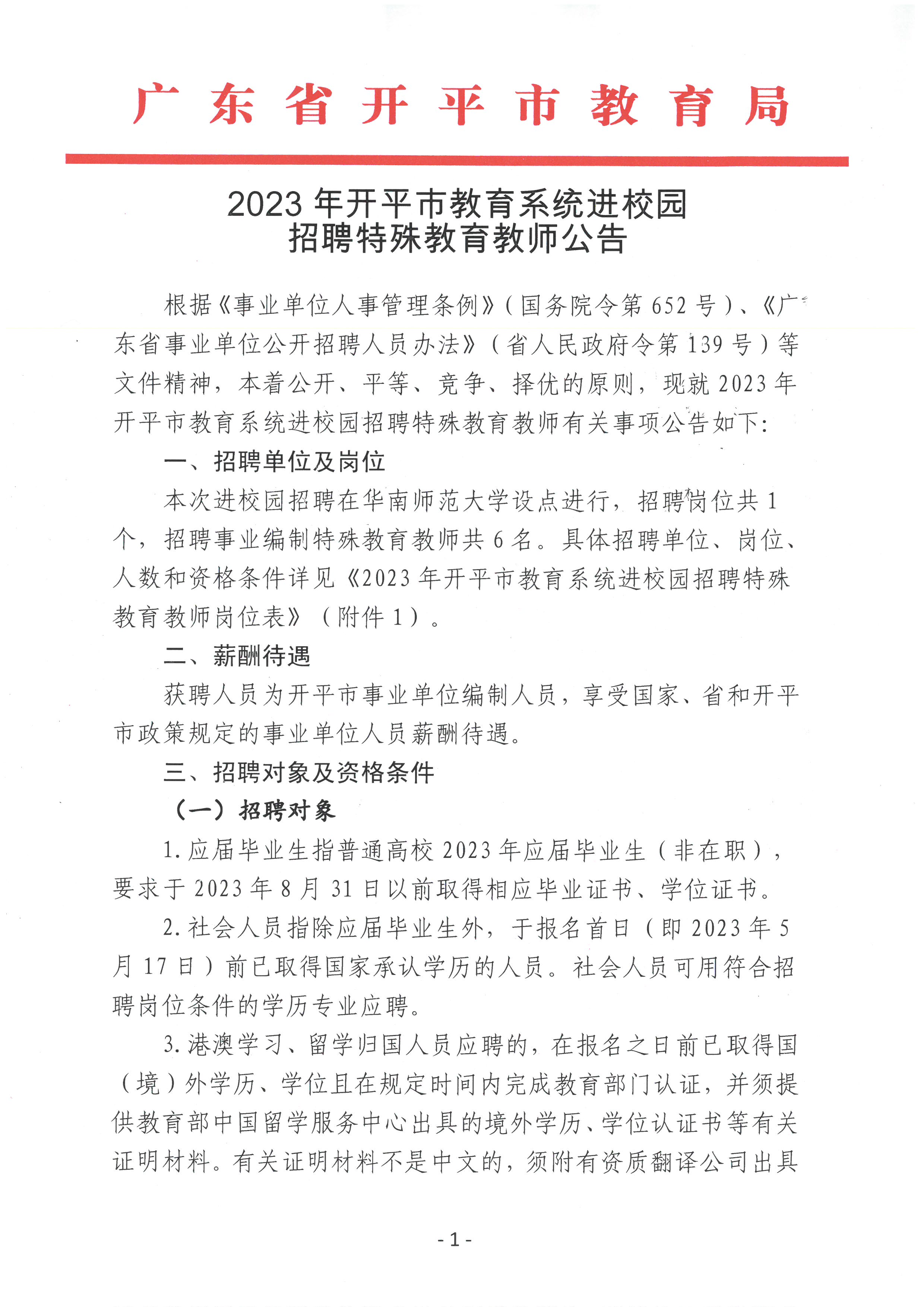2023年廣東江門開(kāi)平市教育系統(tǒng)進(jìn)校園招聘特殊教育教師6人公告