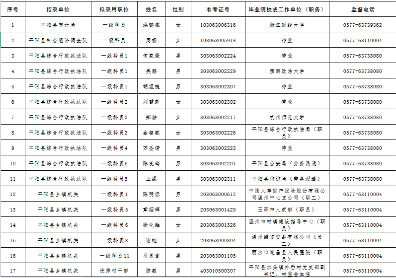 根據(jù)《2023年溫州市各級機關(guān)單位考試錄用公務(wù)員公告》精神,經(jīng)過公開報名、筆試、面試、體檢、考察等程序,擬錄用洪璐朦等17名同志為平陽縣公務(wù)員(參照公務(wù)員法管理單位工作人員),現(xiàn)予以公示。