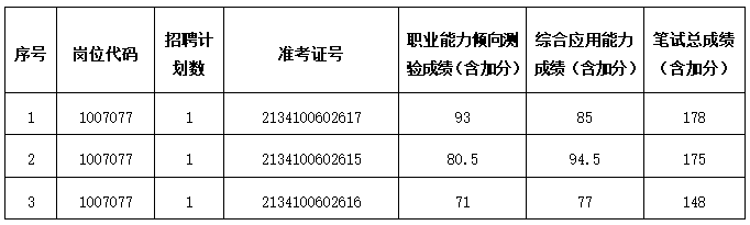 按照筆試成績(jī)(達(dá)到最低控制合格分?jǐn)?shù)線且無(wú)任一科成績(jī)低于60分)從高分到低分順序,根據(jù)招聘崗位計(jì)劃數(shù),按1:3比例確定各崗位專業(yè)測(cè)試入圍人選(最后一名有數(shù)名考生筆試成績(jī)相同的,一并確定為入圍人選),專業(yè)測(cè)試入圍人選參加資格復(fù)審,入圍人選名單見(jiàn)附件。