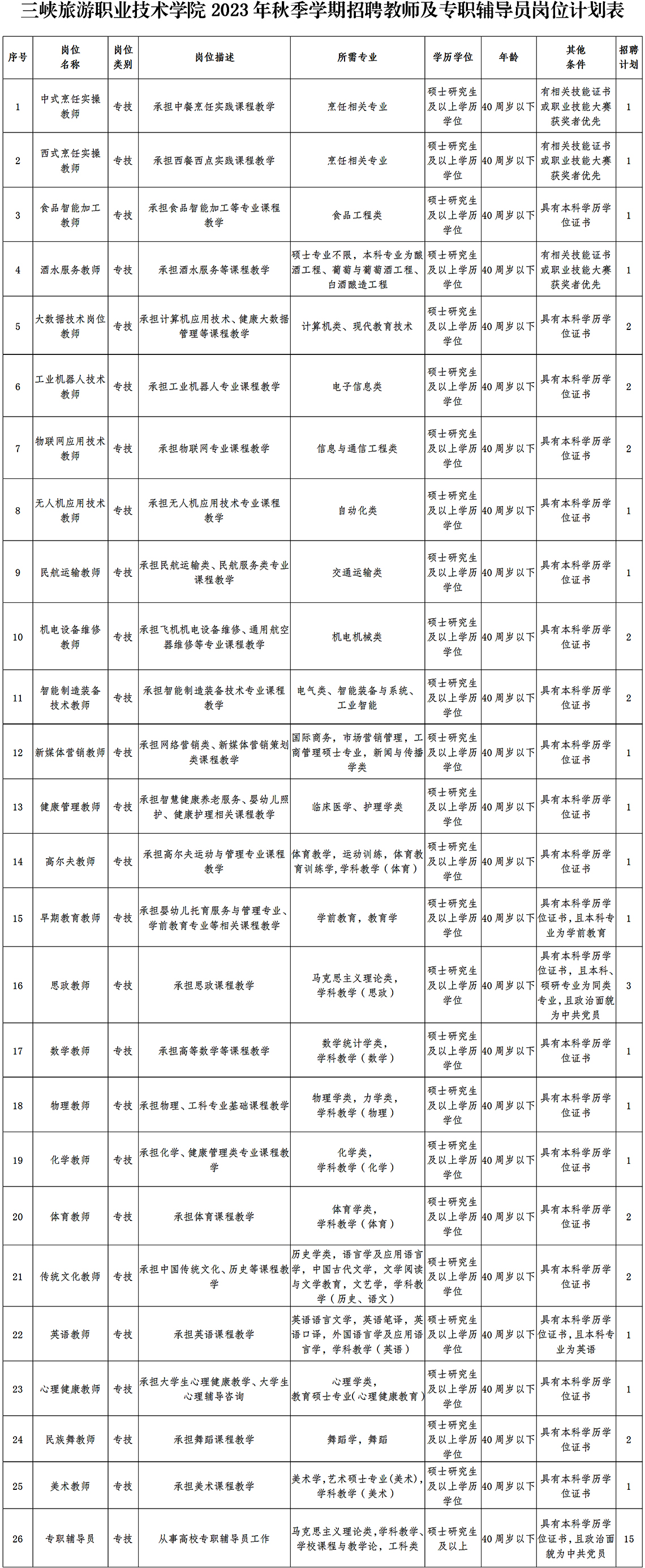 三峽旅游職業(yè)技術學院2023年秋季學期招聘教師及專職輔導員公告
