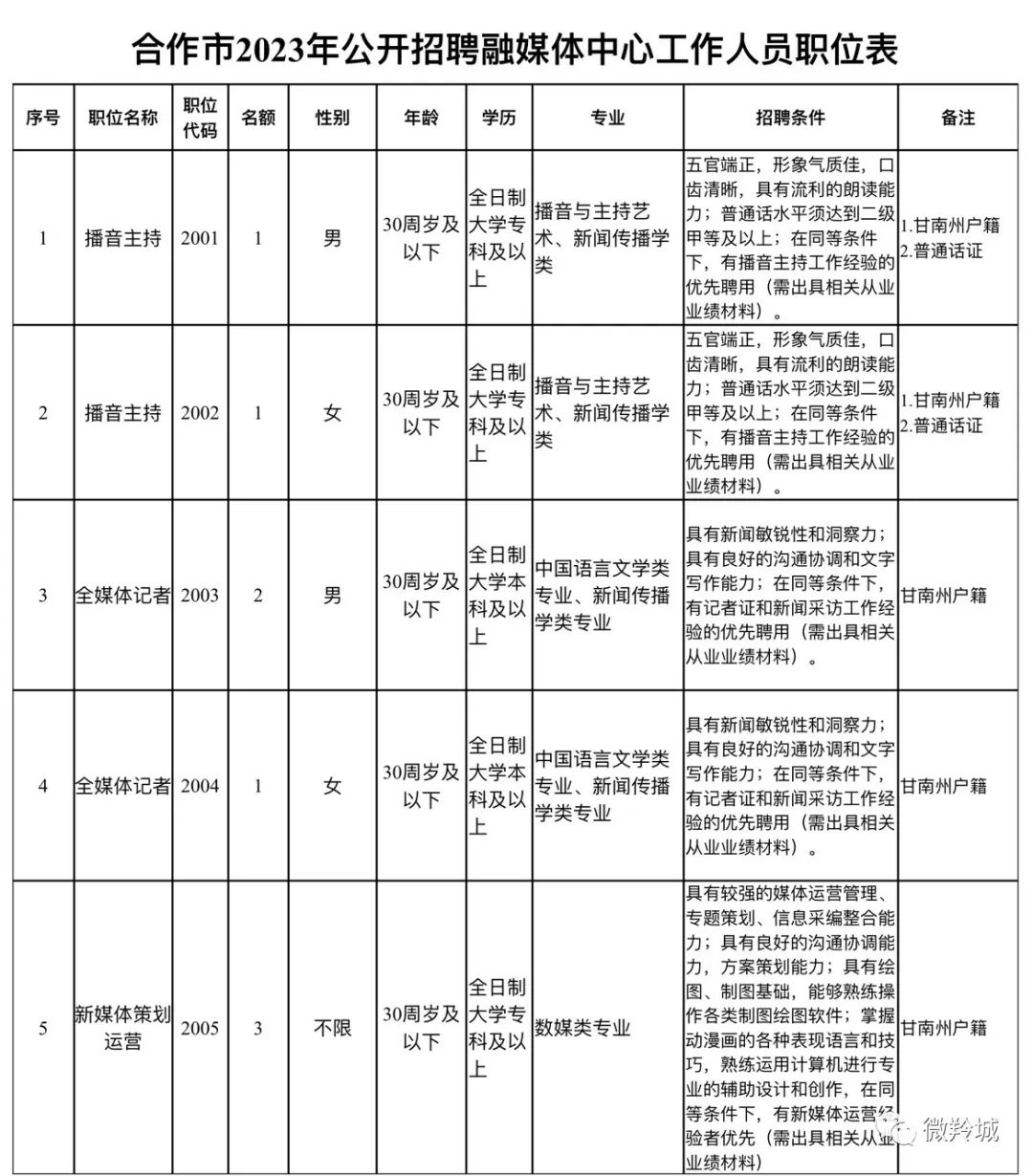 面向甘南州范圍內(nèi)招聘具有甘南州戶籍的融媒體中心工作人員8名:其中播音主持2名;全媒體記者3名;新媒體策劃運營3名; 具體職位要求見《合作市2023年公開招聘融媒體中心工作人員職位表》。
