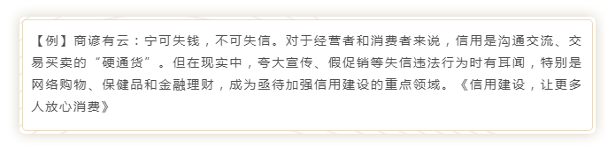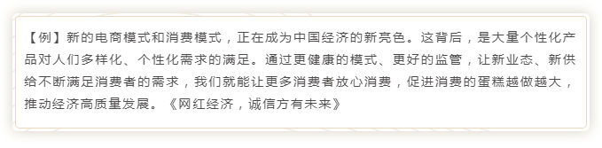【例】《戶外運(yùn)動(dòng),當(dāng)遵守法紀(jì)敬畏自然》《消費(fèi)升級,以蓬勃內(nèi)需推動(dòng)長期增長》《信用建設(shè),讓更多人放心消費(fèi)》《中國慕課,促進(jìn)“互聯(lián)網(wǎng)+教育公平”》