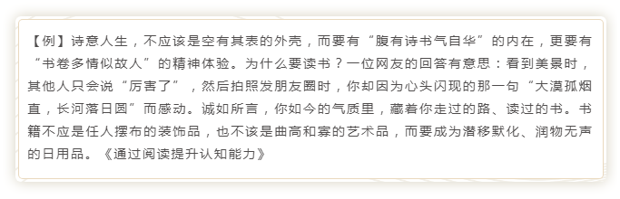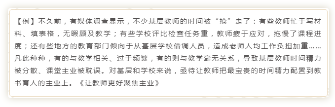 【例】《讓教師更好聚焦主業(yè)》《個(gè)人信息需要制度保險(xiǎn)箱》《為師者必須以德為先》《治城市內(nèi)澇,先治政績觀》
