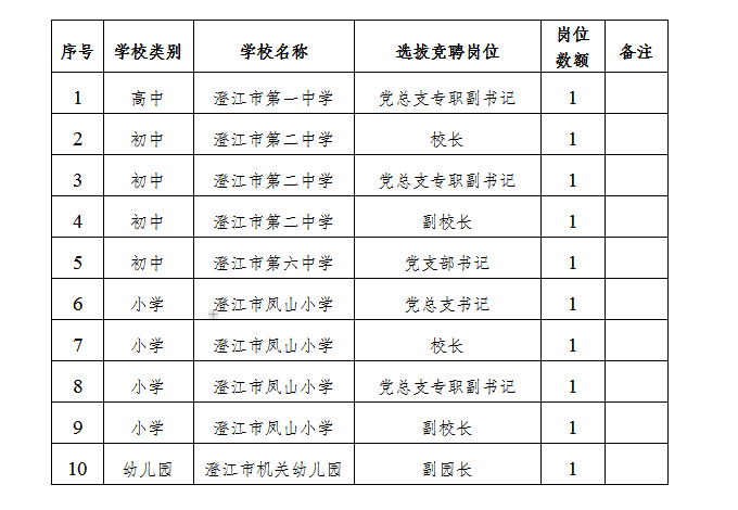 選拔競聘工作在市委教育工作領(lǐng)導小組領(lǐng)導下進行,市委組織部和市教育體育局具體負責組織實施,市委編辦、市人社局等部門配合,按照“公開、平等、競爭、擇優(yōu)”的原則,對部分學校領(lǐng)導人員崗位實行公開選拔競聘。其中,高中學校副職1名;初中學校正職2名、副職2名;小學學校正職2名、副職2名,幼兒園副職1名。具體崗位如下: