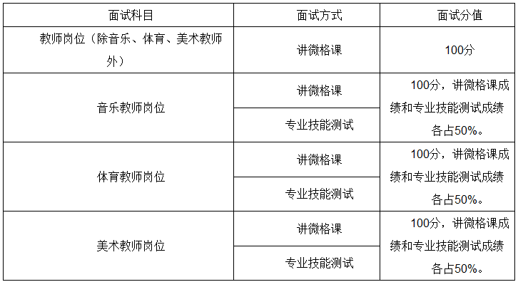1.面試方式。面試方式為講微格課或講微格課+專業(yè)技能測試(具體崗位面試方式見附件1)。面試成績滿分均為100分。其中面試方式為講課+技能測試的崗位講課和技能測試各占50分。