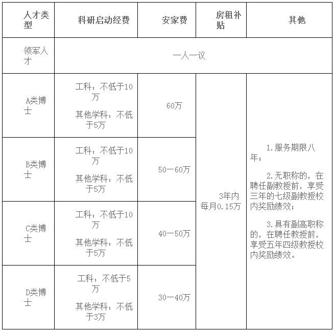 ?。ㄒ唬┮M和招聘人才享受的待遇包含科研啟動經(jīng)費、安家費、房租補貼等,具體標準如下表: