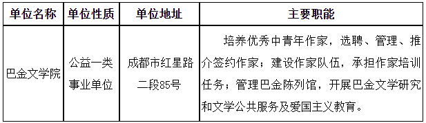 根據(jù)《事業(yè)單位人事管理?xiàng)l例》《事業(yè)單位公開招聘人員暫行規(guī)定》和《四川省省屬事業(yè)單位公開招聘工作人員實(shí)施細(xì)則(試行)》等規(guī)定,四川省作家協(xié)會(huì)(以下簡稱“省作協(xié)”)擬面向社會(huì)考核招聘1名工作人員到我會(huì)直屬事業(yè)單位巴金文學(xué)院工作。現(xiàn)將考核招聘有關(guān)事項(xiàng)公告如下。(本公告由省作協(xié)同時(shí)在四川省人力資源和社會(huì)保障廳官網(wǎng)[rst.sc.gov.cn,下同]“人事考試”專欄和四川作家網(wǎng)[www.sczjw.net.cn,下同]上發(fā)布)