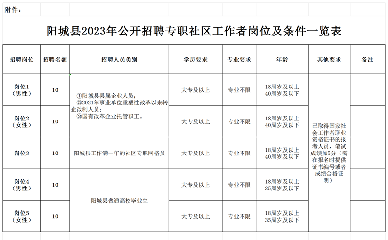 附件:《陽城縣2023年公開招聘專職社區(qū)工作者崗位及條件一覽表》??
