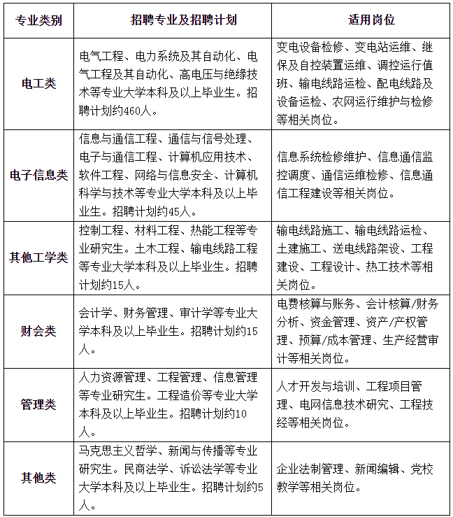招聘專業(yè)類別為電工類、電子信息類、其他工學(xué)類、財(cái)會類、管理類及其他專業(yè),招聘專業(yè)是指主修專業(yè),不包含輔修專業(yè)。因上級單位尚未核定下達(dá)2024年招聘計(jì)劃,最終招聘數(shù)量將根據(jù)上級單位核定情況相應(yīng)調(diào)整。第一批招聘計(jì)劃(含提前批招聘計(jì)劃)暫定如下: