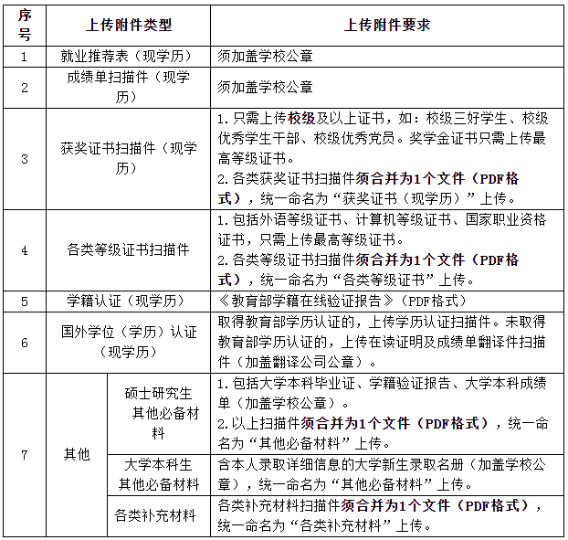 3.上傳應(yīng)聘附件材料。應(yīng)聘畢業(yè)生須通過招聘平臺及時(shí)、規(guī)范上傳個(gè)人應(yīng)聘附件材料,應(yīng)聘附件材料文檔數(shù)量不超過7個(gè)。應(yīng)聘畢業(yè)生應(yīng)確保應(yīng)聘材料能正常打開、清晰顯示,因應(yīng)聘材料不能正常打開、圖像不清晰或未按規(guī)范要求填報(bào)導(dǎo)致的結(jié)果由應(yīng)聘畢業(yè)生本人承擔(dān)。上傳附件具體要求如下: