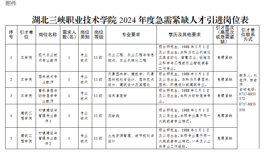 附件1:湖北三峽職業(yè)技術學院2024年急需緊缺人才引進崗位表