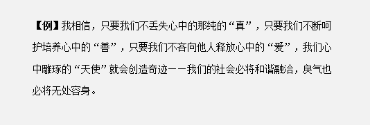 展望式常用句式:只有……(重復(fù)觀點)+才能+升華(總結(jié)式);我相信……/我盼望……/我期待……/我希冀……/我希望……/我們真誠地期望……