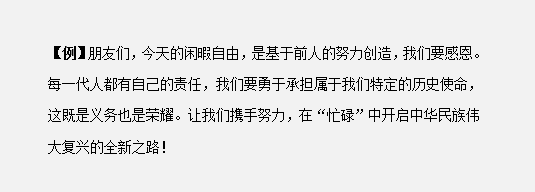 (6)社會大趨勢,總結(jié)前文,呼吁號召:朋友們,……基于……,我們要……。要勇于承擔(dān)……的歷史使命。讓我們……開啟中華民族偉大復(fù)興的全新之路!