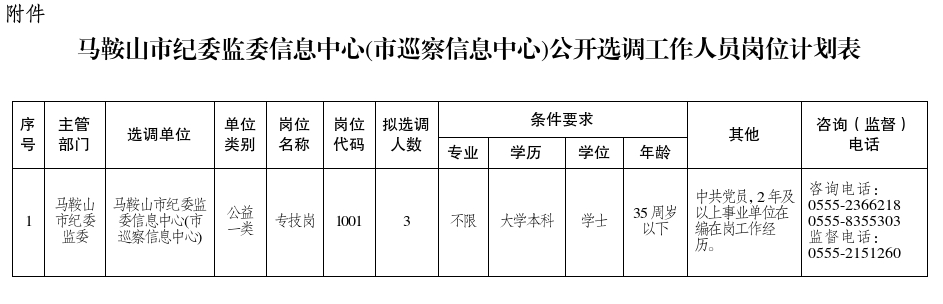 附件:馬鞍山市紀委監(jiān)委信息中心(市巡察信息中心)公開選調(diào)工作人員崗位計劃表