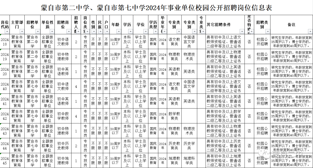 詳見(jiàn)《蒙自市第二中學(xué)2024年校園公開(kāi)招聘崗位信息表》(附件1)。
