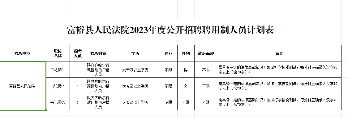 (八)限齊齊哈爾行政區(qū)劃內(nèi)戶籍人員報考(詳見附件1:《富裕法院2023年公開招聘聘用制人員計劃表》)。