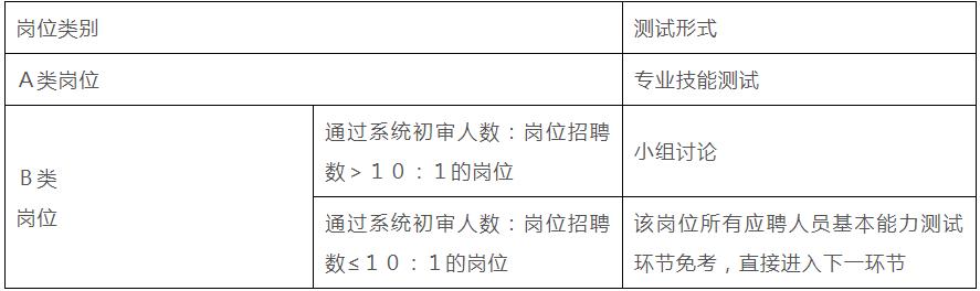 暫定2023年12月下旬進(jìn)行,具體時(shí)間和地點(diǎn)以準(zhǔn)考證為準(zhǔn)?;灸芰y(cè)試主要采取專業(yè)技能測(cè)試、小組討論等形式,對(duì)應(yīng)聘人員進(jìn)行考察。各崗位具體考核形式見下表: