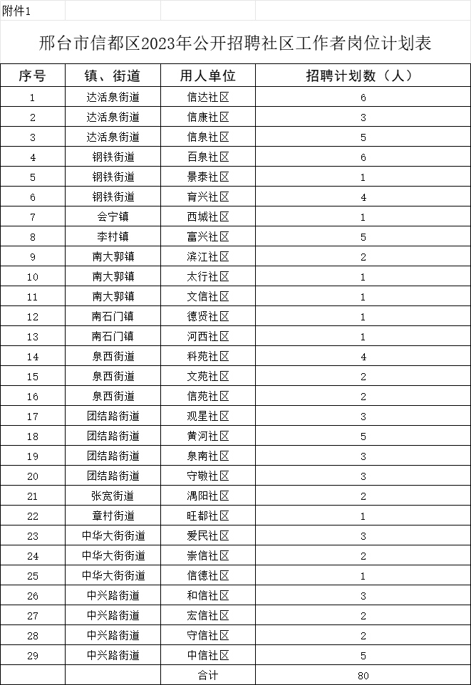 公開招聘社區(qū)工作者共80名,具體崗位計(jì)劃詳見《邢臺市信都區(qū)2023年公開招聘社區(qū)工作者崗位計(jì)劃表》(附件1)。