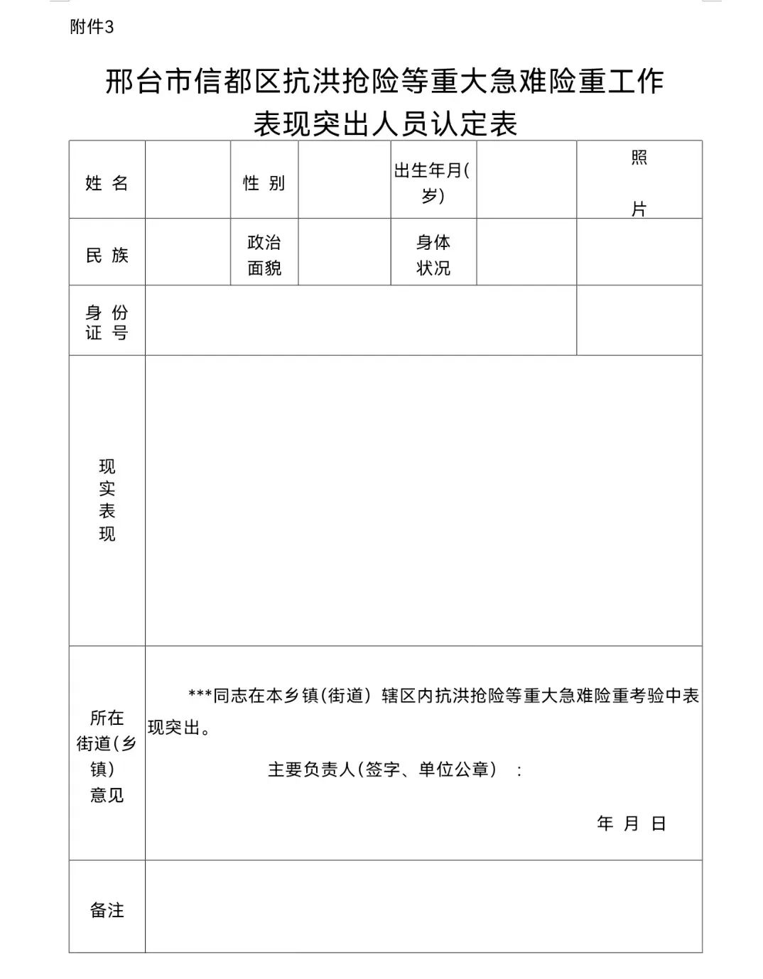 3.《邢臺市信都區(qū)抗洪搶險(xiǎn)等重大急難險(xiǎn)重工作表現(xiàn)突出人員認(rèn)定表》
