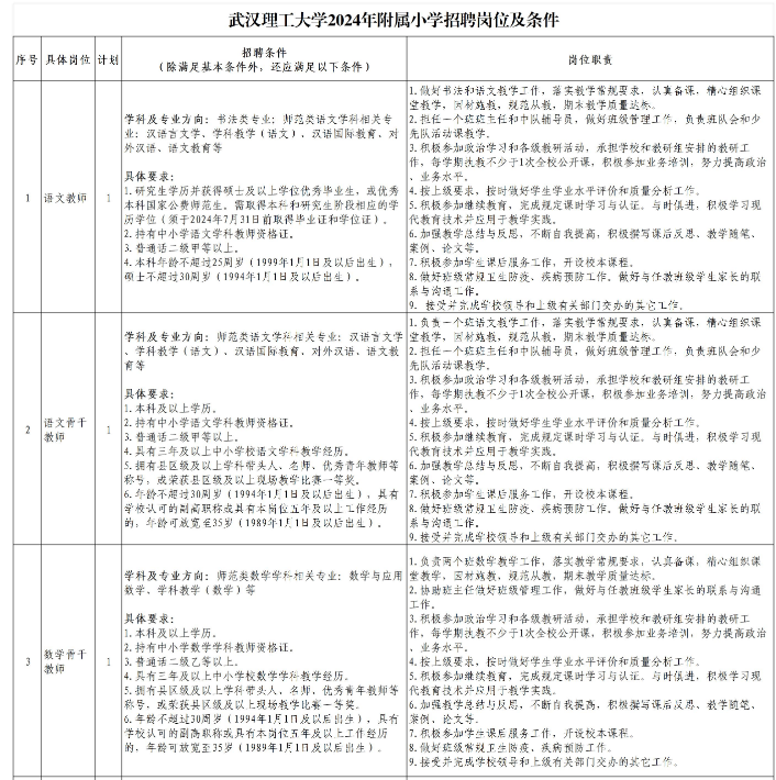 武漢理工大學(xué)2024年附屬小學(xué)教師招聘啟事