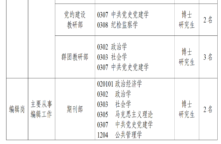 為進(jìn)一步加強(qiáng)校(院、室)人才隊(duì)伍建設(shè),根據(jù)教學(xué)科研和學(xué)科建設(shè)需要,按照《天津市事業(yè)單位公開招聘人員實(shí)施辦法(試行)》(津人社局發(fā)〔2011〕10號(hào))、《市委組織部市人力社保局關(guān)于進(jìn)一步完善事業(yè)單位公開招聘工作的通知》(津人社局發(fā)〔2017〕37號(hào))和《市委組織部市人力社保局關(guān)于進(jìn)一步做好事業(yè)單位公開招聘高校畢業(yè)生等有關(guān)工作的通知》(津人社辦發(fā)〔2020〕100號(hào)),2024年,中共天津市委黨校(天津行政學(xué)院、中共天津市委黨史研究室)擬面向全國公開招聘31名博士研究生人員?,F(xiàn)公告如下: