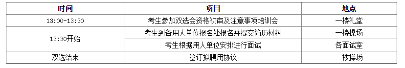 應聘人員需在上述時間內攜帶應聘材料至雙選會會場參加公開招聘,未到場者視為自動放棄招聘資格,具體安排如下: