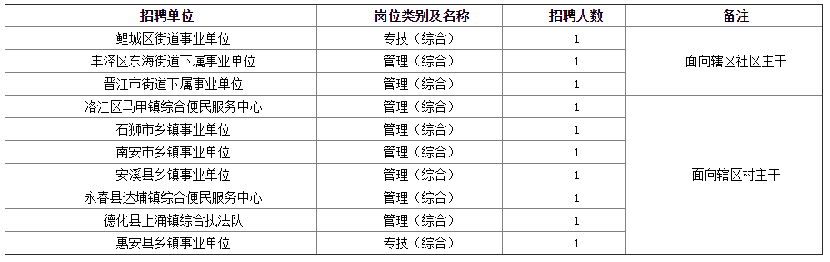 備注:未明確具體招聘單位的,新聘用人員由具體縣(市、區(qū))參照公務(wù)員專項(xiàng)考試,原則上安排在所在鄉(xiāng)鎮(zhèn)(街道)事業(yè)單位聘用或就近安排聘用,不得安排在聘用后即構(gòu)成應(yīng)回避關(guān)系的崗位。