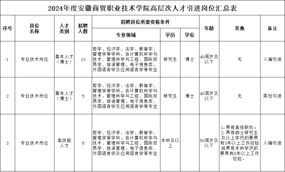 為做好2024年度安徽商貿(mào)職業(yè)技術(shù)學(xué)院高層次人才引進(jìn)工作,根據(jù)《事業(yè)單位人事管理條例》(國務(wù)院令第652號)和中共安徽省委組織部、安徽省人力資源社會保障廳《關(guān)于印發(fā)〈安徽省事業(yè)單位公開引進(jìn)人員暫行辦法〉的通知》(皖人社發(fā)〔2010〕78號)、《關(guān)于進(jìn)一步做好省屬高校公開引進(jìn)工作的通知》(皖人社秘〔2018〕369號)規(guī)定,現(xiàn)就我校人才引進(jìn)有關(guān)事項公告如下:
