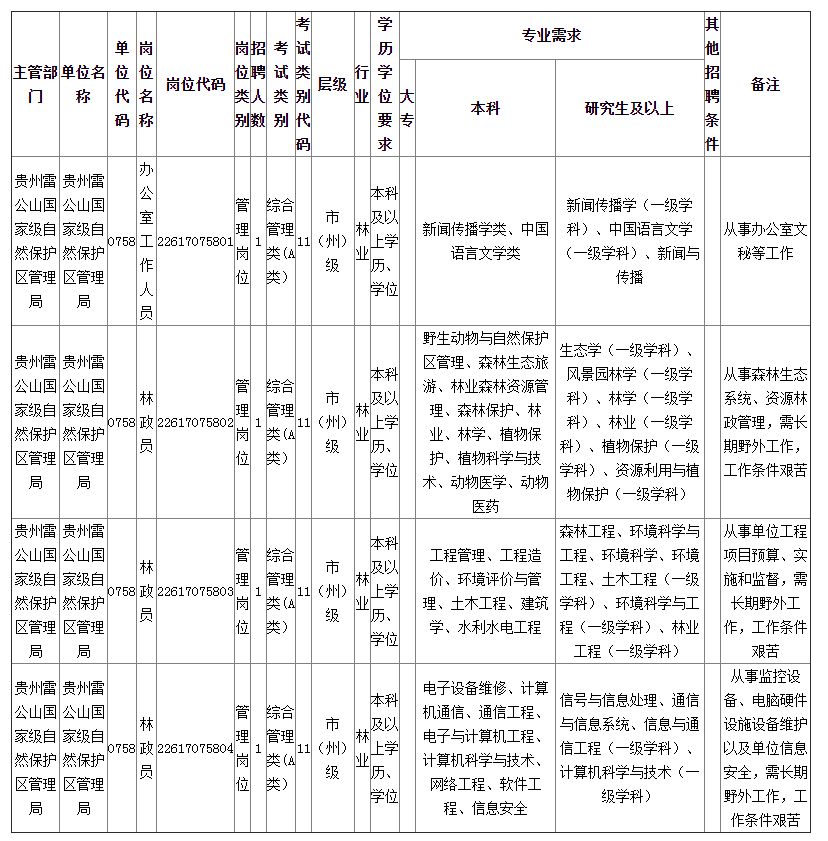 一、貴州雷公山國家級自然保護(hù)區(qū)管理局(招聘崗位代碼:22617075801、22617075802、22617075803、22617075804)崗位專業(yè)需求調(diào)整為: