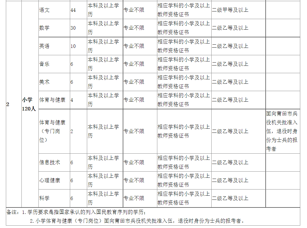 為進(jìn)一步優(yōu)化我縣教師隊伍結(jié)構(gòu),推進(jìn)新課程改革,促進(jìn)教育均衡發(fā)展,根據(jù)省教育廳、省委編辦、省財政廳、省人社廳《關(guān)于進(jìn)一步做好全省中小學(xué)幼兒園教師補(bǔ)充工作的若干措施》(閩教規(guī)〔2022〕3號)、省教育廳、省人社廳《關(guān)于2024年全省中小學(xué)幼兒園教師公開招聘筆試服務(wù)工作的通知》(閩教師〔2024〕2號)和莆田市退役軍人事務(wù)局、莆田市教育局、莆田市人力資源和社會保障局《關(guān)于轉(zhuǎn)發(fā)《福建省促進(jìn)優(yōu)秀退役軍人到中小學(xué)任教九條措施》的通知》(莆退役軍人局〔2023〕49號)精神,結(jié)合我縣教師隊伍實際情況,現(xiàn)制定2024年中小學(xué)教師公開招聘方案公告如下: