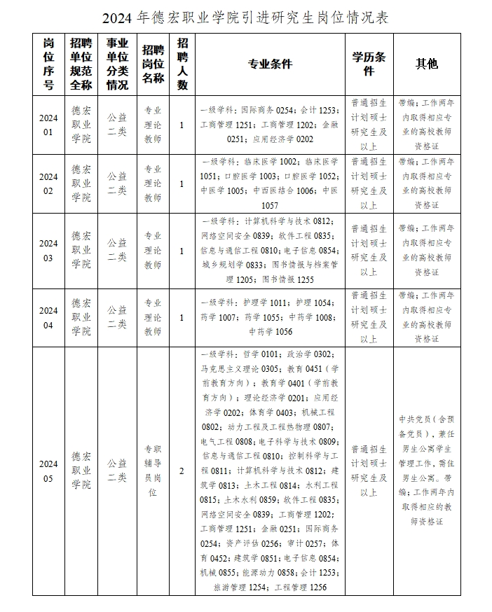 德宏職業(yè)學(xué)院2024年引進(jìn)研究生公告