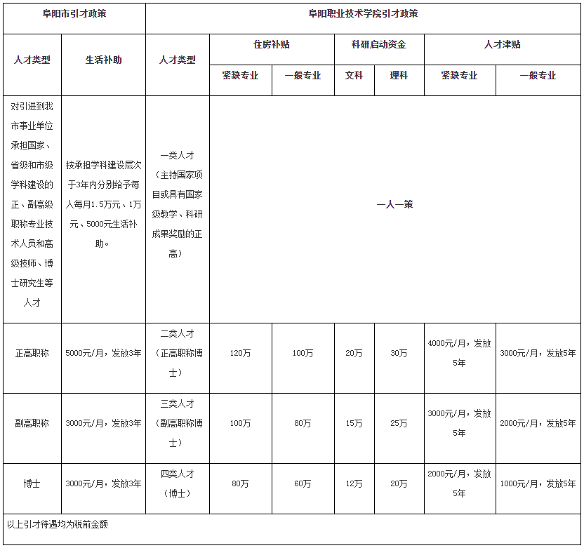 對(duì)于引進(jìn)的高層次人才,按照阜陽市和學(xué)校引才政策提供住房補(bǔ)貼、科研啟動(dòng)費(fèi)、人才津貼、生活補(bǔ)助等,具體見表2。