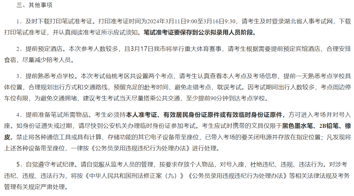 2024年湖北公務(wù)員考試筆試仙桃考區(qū)溫馨提示