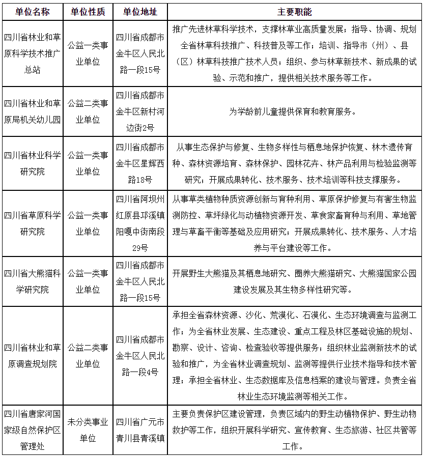本次招聘均在事業(yè)單位經(jīng)批準(zhǔn)設(shè)置的崗位內(nèi)招聘,招聘名額為42名,其中四川省林業(yè)和草原科學(xué)技術(shù)推廣總站1名、四川省林業(yè)和草原局機(jī)關(guān)幼兒園4名、四川省林業(yè)科學(xué)研究院15名、四川省草原科學(xué)研究院6名、四川省大熊貓科學(xué)研究院1名、四川省林業(yè)和草原調(diào)查規(guī)劃院12名、四川省唐家河國家級自然保護(hù)區(qū)管理處3名,具體崗位見《崗位和條件要求一覽表》。